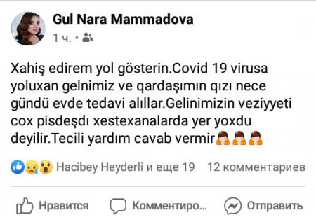 Gülnarə Məmmədova gəlinlərinin virusa yoluxduğunu qeyd edib: "Xahiş edirəm, yol göstərin. COVİD-19 virusuna yoluxan gəlinimiz və qardaşımın qızı neçə gündür, evdə müalicə alırlar.