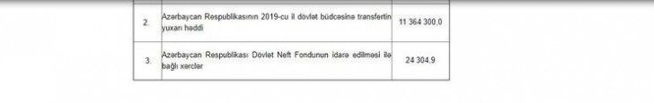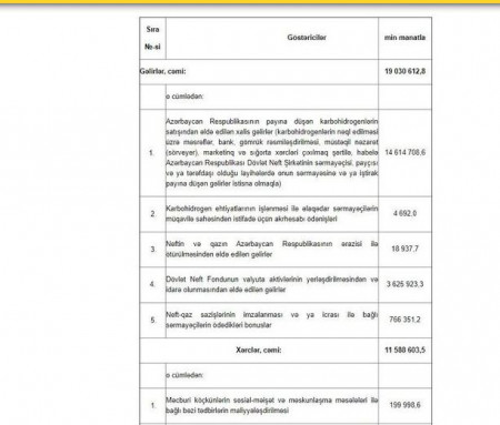 Sərəncama əsasən, Azərbaycan Respublikası Dövlət Neft Fondunun 2019-cu il büdcəsinin icrası, gəlirlər 19 030 612,8 min manat, xərclər 11 588 603,5 min manat və ya Fondun 2019-cu il büdcəsində nəzərdə tutulana nisbətən gəlirlər üzrə 123,2 faiz, xərclər üzrə 99,9 faiz səviyyəsində olmaqla, aşağıdakı kimi təsdiq edilib: