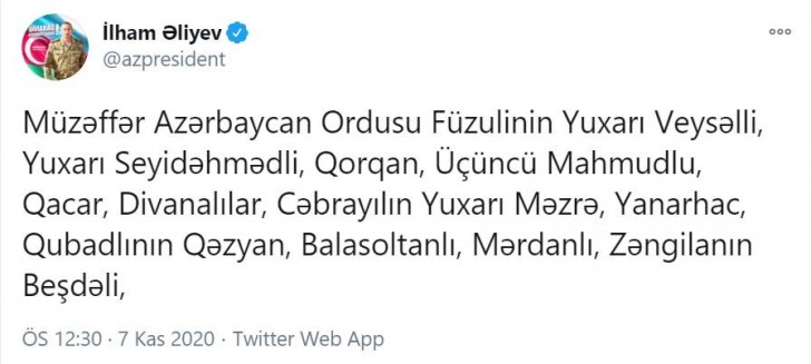"Müzəffər Azərbaycan Ordusu Füzulinin Yuxarı Veysəlli, Yuxarı Seyidəhmədli, Qorqan, Üçüncü Mahmudlu, Qacar, Divanalılar, Cəbrayılın Yuxarı Məzrə, Yanarhac, Qubadlının Qəzyan, Balasoltanlı, Mərdanlı, Zəngilanın Beşdəli, Xocalının Qarabulaq, Moşxmaat, Xocavəndin Ataqut, Tsakuri kəndlərini işğaldan azad etmişdir. Eşq olsun Azərbaycan Ordusuna! Qarabağ Azərbaycandır!”.